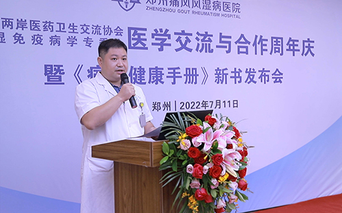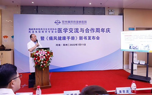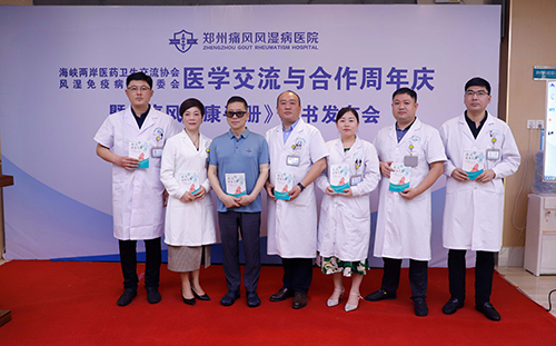 7月11日,郑州痛风风湿病医院与海峡两岸医药卫生交流协会风湿免疫病学专委会医学交流与合作周年庆暨《痛风健康手册》新书发布会在郑州痛风风湿病医院隆重举行。海峡两岸医药卫生交流协会风湿免疫病学专委会主任委员黄慈波,郑州痛风风湿病医院业务副院长杜爱华、门诊主任程本维、徐学成、朱文浩、郑家琛、陈会想等出席仪式。